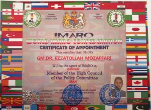 بر اساس گواهی نخست که با عنوان Certificate of Appointment صادر شده است، دکتر مظفری بهعنوان نماینده رسمی کنفدراسیون جهانی ایمارو در استان زنجان منصوب شده و همزمان به عنوان عضو شورای عالی کمیته پلینت (High Council of the Point Committee) در سطح جهانی معرفی گردیده است.