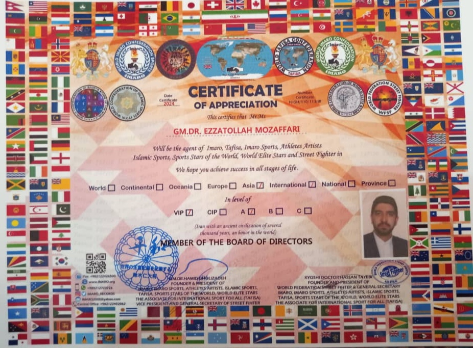این دو گواهینامه که با مهر و امضای رسمی رؤسای عالیرتبه کنفدراسیون جهانی صادر شدهاند، بیانگر نقشآفرینی دکتر عزتالله مظفری در توسعه فعالیتهای ایمارو در ایران و همچنین گسترش همکاریهای بینالمللی در حوزه ورزشهای رزمی، فرهنگی و اجتماعی است.