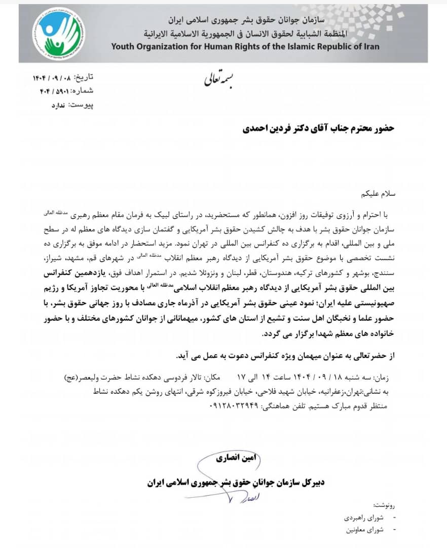 دعوت ویژه سازمان جوانان حقوق بشر ایران از دکتر فردین احمدی برای حضور در یازدهمین کنفرانس بین‌المللی حقوق بشر آمریکایی