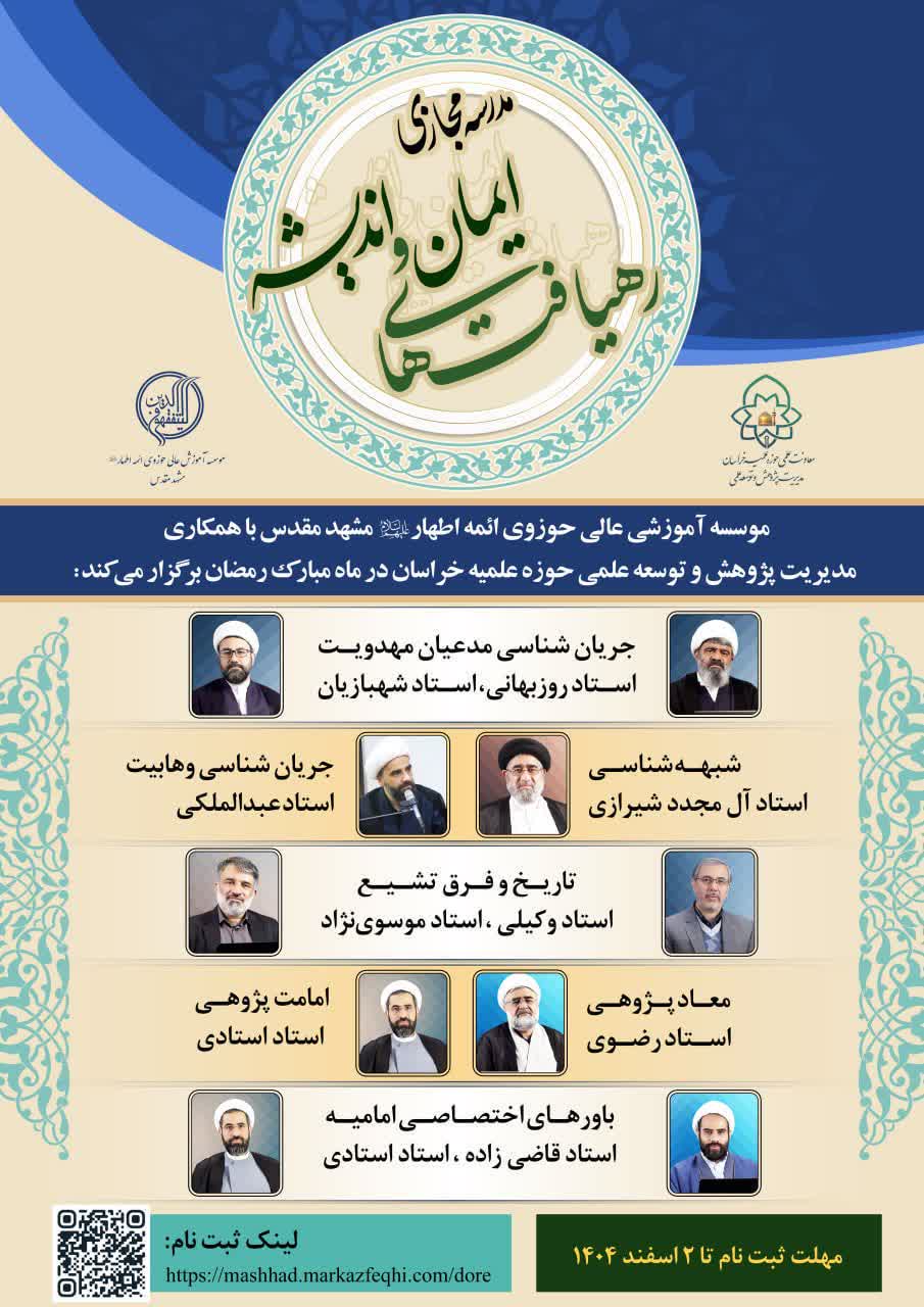 موسسه آموزش عالی حوزوی ائمه اطهار علیهم السلام مشهد مقدس با همکاری مدیریت پژوهش و توسعه علمی حوزه علمیه خراسان دورههای زیر را به صورت مجازی در ماه مبارک رمضان برگزار میکند: